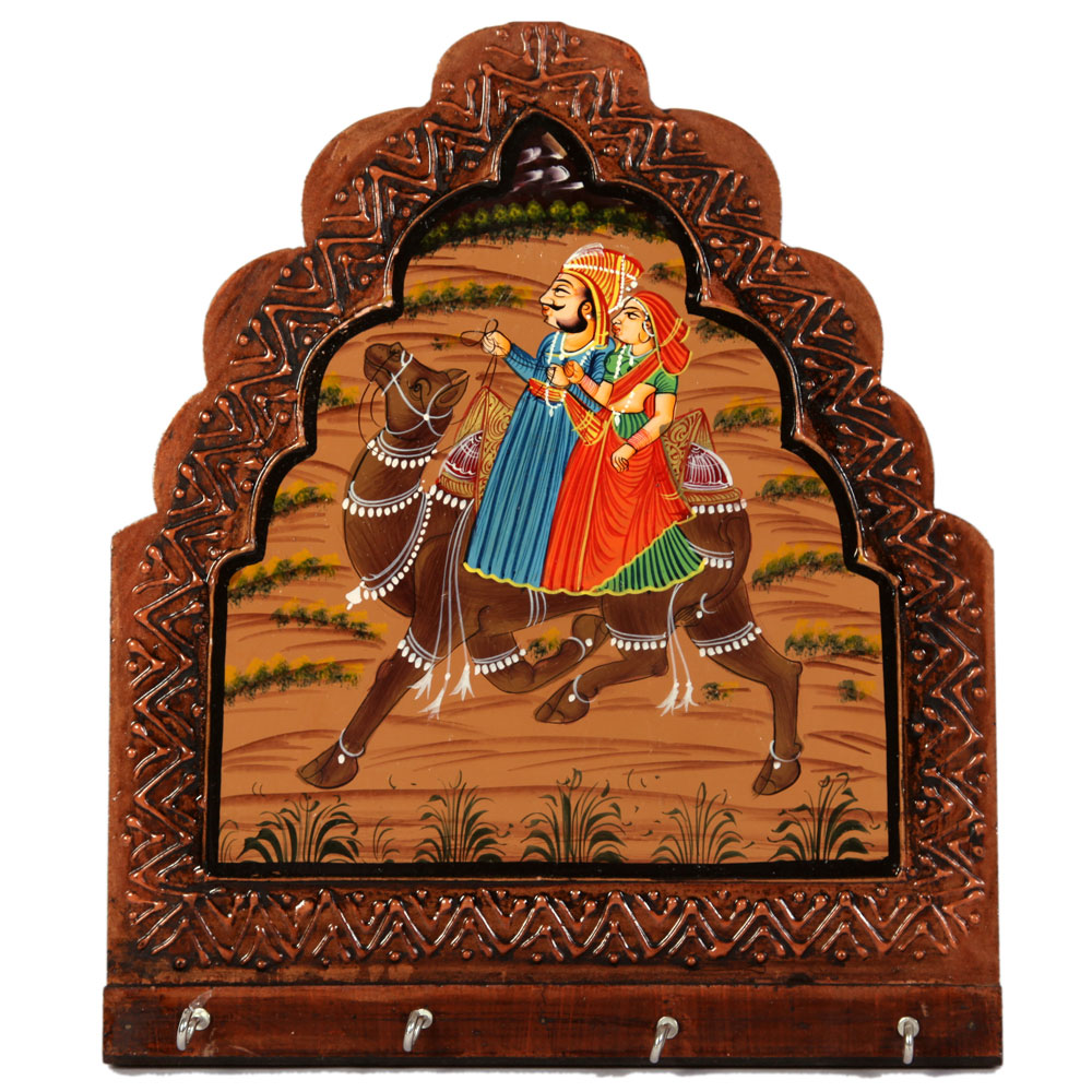 This wooden key holder, shaped like a traditional Rajasthani jharokha has intricate self-carvings all along the border. Enclosed within this carved frame is the beautiful painting of a couple mounted on a camel. At the base of the frame are the five hooks that can be used for hanging keys. Indian household gift items or retirement gifts India!